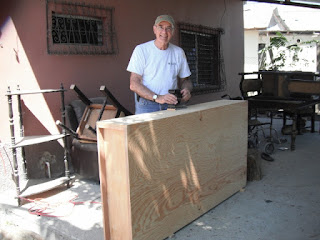 Today we finished two small computer tables and two bookcases for the HAF office in Quimistan. Bruce and Jim started on this project yesterday while the other team members went to Laguna del Carmen. The first task was to visit the local wood/cabinet shop, which is outdoors under a rusty metal roof. Since our interpreter was with the other team members, Jim and Bruce signaled, gestured, and did everything required to communicate with the guy who was helping us. After 1.5 hours, all of the lumber was cut. Now we had to get it transported to the HAF office. The sides of the bookcases were 6 feet long. So, the wood shop guy called a taxi for us. Taxis in Quimistan are 3-wheeled vehicles sort of like 3-wheeled motorcycles. These things zip around all over Quimistan and are fun to ride in, since they have no doors. Bruce and Jim wondered how we were going to get the stack of lumber “in” this thing. The taxi driver stacked the lumber across the floor of the vehicle with about 3 feet of the bookcase sides sticking out on the driver’s side. Bruce and Jim sat with our feet on top of the pile of lumber. The driver did not let this load affect his driving speed. He zipped along looking like he was going to clip a pedestrian at the knees, or swipe an oncoming car. Luckily, we made the trip with no injuries. Bruce is considering buying one of these vehicles for Maxine to drive grocery shopping.