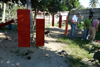 We all worked today to build the second bookcase and to paint everything with varnish stain. The lady next door to the HAF office building let us sand and paint our things in her fenced back yard. Lorraine had the idea to hang the newly-painted shelves on the lady’s clothesline while the paint dried. Everything looks great and Maynor is happy to have the much-needed office furniture, and he really likes the color of the paint which is caoba (mahogany).