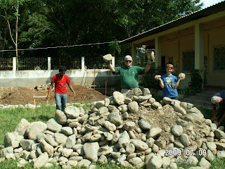 We started out this morning by dividing ourselves into those going to work in Santa Clara and those staying to work in Quimistan and went our separate ways. Cookita, George, Roxanne, and myself stayed in Quimistan to help work on the kitchen for the kindergarten. Like I said before, it was hard work. We carried the rocks or boulders (whichever you prefer) to the trenches. And then we sat for a while because the re-bar had not been delivered yet. Luckily, our break was during recess so we were able to play with the kids. After a while, Roxanne picked up concrete and we began to fill the trenches. This took up the rest of the day and we will have more to do tomorrow. I’m so grateful that our friends, Nelson and Rigo, helped out today because we would not have gotten as far without them, as none of us are strong, young men. (No offense George)
