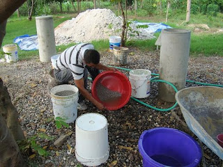 In the mid afternoon, we began working with the “special” sand that is used for filter media. This process includes sieving the material through four grades of wire mesh from ½ inch down to 0.03 inches. This smallest fraction of sand is then washed to remove particles that are too small to use in the filter. We are able to produce about one bucket of filter grade sand for every 10 buckets that start the process. So, we are very grateful for the assistance of Maynor and Jose Maria who worked all day long to assist with training the two pastors.