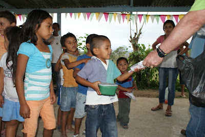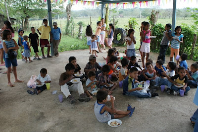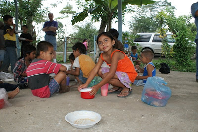 George, Lee, and Tommy attended the feeding at Tejeras Friday afternoon during a light rain. Unfortunately, the chairs had not been delivered, so the children sat on the concrete slab and fought off the chickens to eat their meal. Gloria prepared one of her delicious meals, chicken pastalitas, which the children enjoyed as much or more than we do.