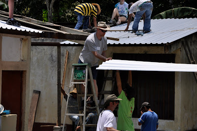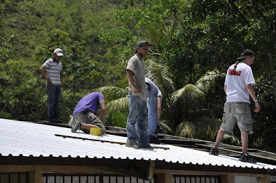 The roofs were to be built using 3X17 pieces of aluminum, all placed and bolted together. The pieces had been stored in one of the school buildings, so we had to carry them all out and lift them up onto the roof. One group lifted them up, and one group placed and bolted them down. The first building was a simple 4-12 (for every 12 inches, it drops 4 inches) A-type roof, 30 feet in length. One side took about an hour and fifteen minutes to complete. The other building was just a smaller version of the first. For the second side we just switched teams. The team that had been on the roof lifted up the aluminum pieces, and the team that had lifted up the aluminum pieces got up on the roof.