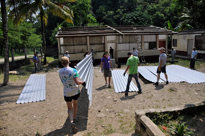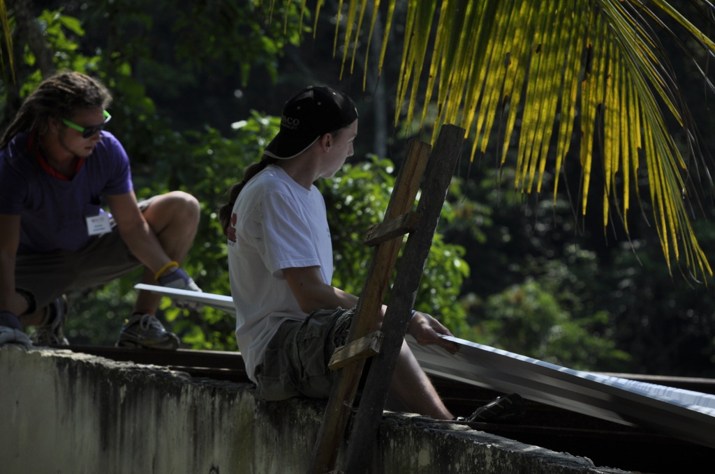 The roofs were to be built using 3X17 pieces of aluminum, all placed and bolted together. The pieces had been stored in one of the school buildings, so we had to carry them all out and lift them up onto the roof. One group lifted them up, and one group placed and bolted them down. The first building was a simple 4-12 (for every 12 inches, it drops 4 inches) A-type roof, 30 feet in length. One side took about an hour and fifteen minutes to complete. The other building was just a smaller version of the first. For the second side we just switched teams. The team that had been on the roof lifted up the aluminum pieces, and the team that had lifted up the aluminum pieces got up on the roof.