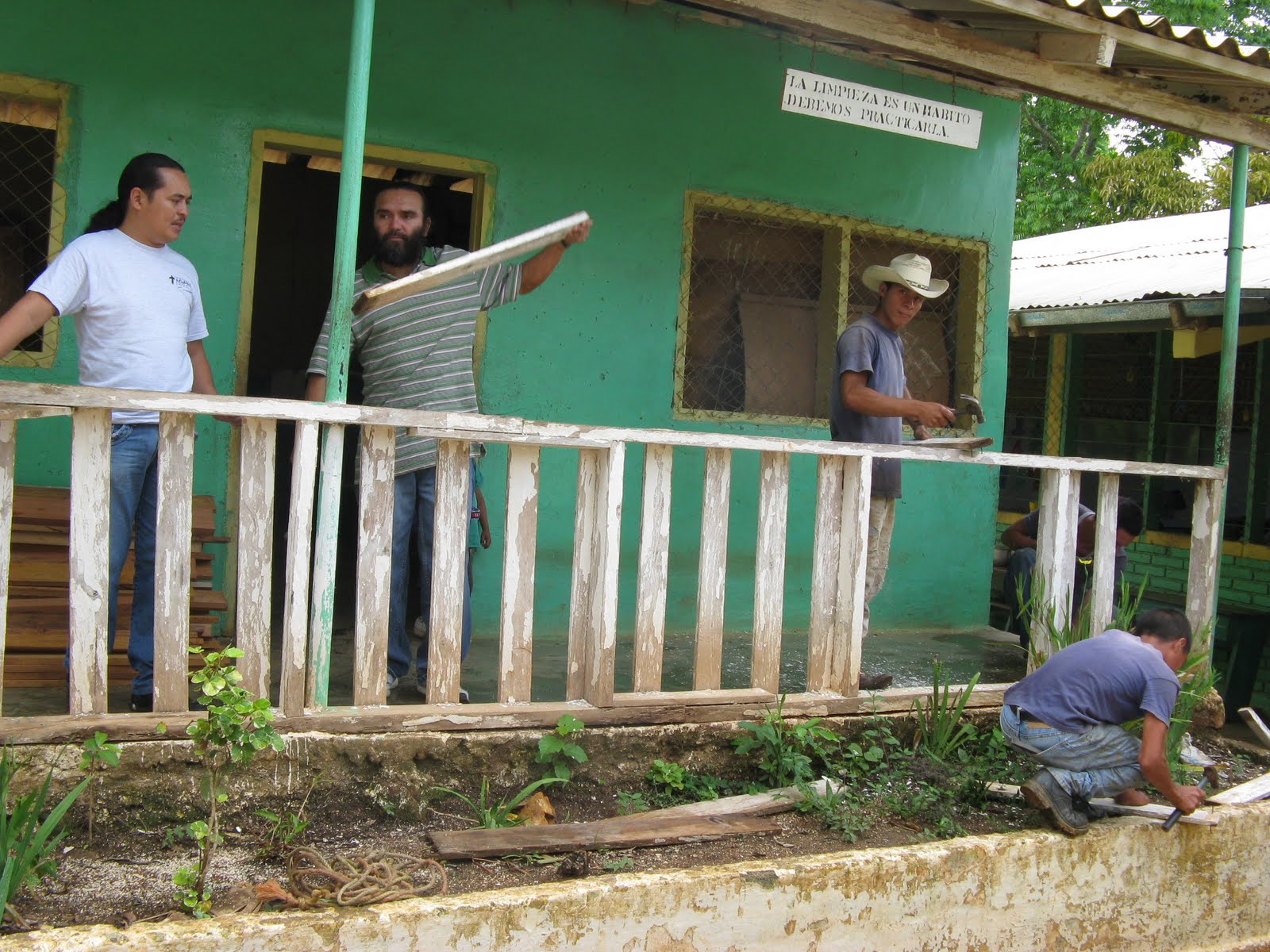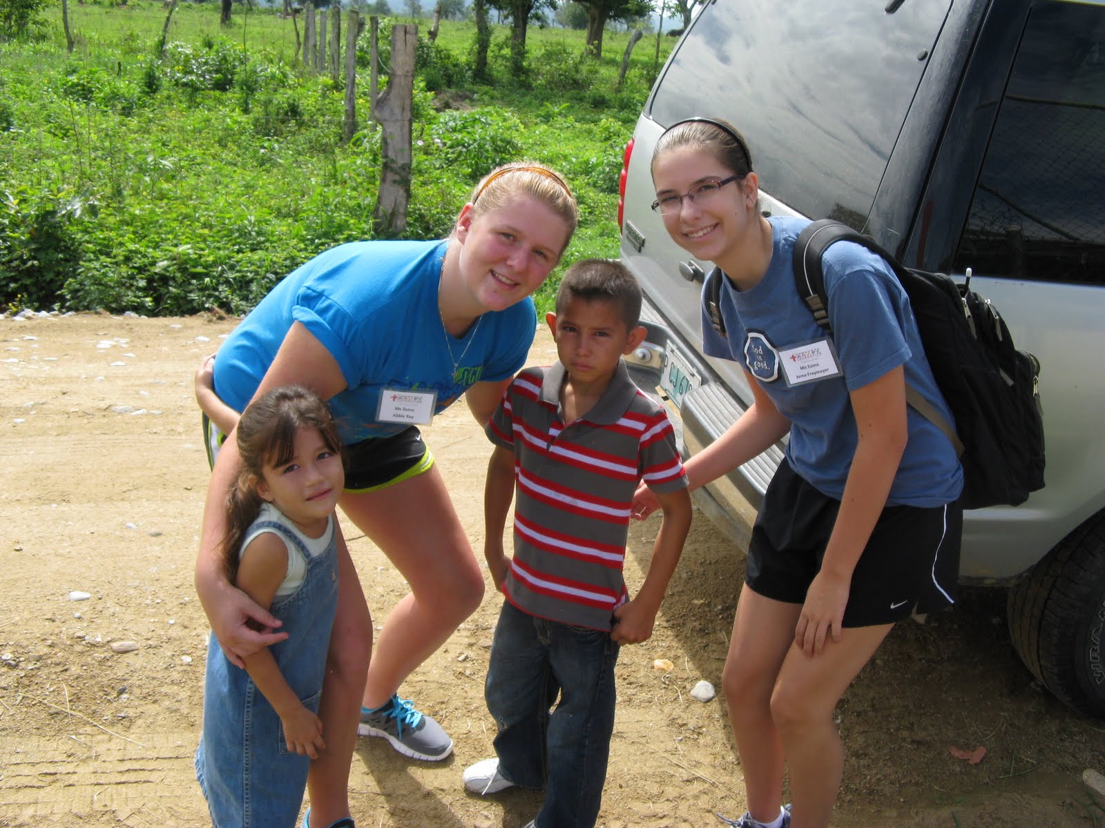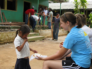 This morning we woke up, ate breakfast and then went to La Moñtanita. Driving up the mountain was scary; Hondurans drive differently than people in the United States. Once there, we started tearing down a rail at the school. The locals took charge of the work. Abby and Anna didn’t feel very useful so they got out a beach ball and played with the children. They were very rough and liked to hit the Americans in the face with the ball to see our reaction. After that, we ate our lunch of PB&Js. (Anna being special got to eat a chicken sandwich.)  We had extra sandwiches so we gave them to Brian, a little boy, and Maria, a little girl. We had more time to play with the kids so Paul, aka Bob, blew up balloons and wouldn’t give them to the children without them saying “balloon”; Annie blew bubbles with them; Melanie colored with them; and Jeff, Anna, and Abby played with the beach ball some more. The children got out of school so we started painting a classroom. It was very difficult because the walls were bricks. There were only 3 paintbrushes so Anna and Abby went to play soccer with some kids; even if they got injured they got back up and played. On the way back to the ranch, we stopped at Maria’s house for coffee and bread stuffed with pineapple. Driving down the mountain was worse than going up; we had to make a 7-point turn to get back down the road. We stopped at the supermarket and met supermarket man carrying our 100 pound of beans and rice. Arriving back at the ranch ,we saw Abner and Rafael. Before dinner we played with them. They ate dinner with us. Dinner consisted of pork chops, rice, tortillas, and vegetables. At the end we had ice cream. Rafael and Abner ate a lot of it so when we played  soccer with them afterwards, they were hyper. Anna and Rafael won the game in the rain against Annie, Abby, and Abner.  All of us put together bags of beans and rice to hand out in La Moñtanita and Teos.