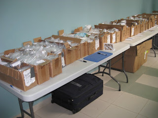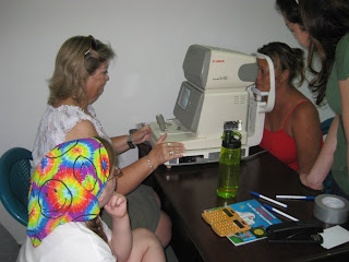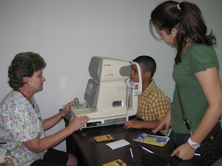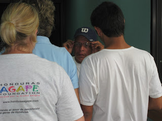 Twas a day for new sight for many in Quimistan as we started our two-day eye clinic at Gracias a Dios hospital. Jenn, Kristen, Karen, Shirlita, and Roxanne worked the clinic with the assistance of about six AP kids and Andrea Pena’s translation services. One hundred and one patients were registered between the hours of 9 am and 4:30 pm. By the end of the day, we had given out 73 pairs of glasses and seen 70 of the 110 patients. The ones not yet seen today were asked to come back first thing tomorrow am to receive their screenings and eyeglass fittings. Because the autorefractor chose to “sleep in” for about an hour this am, we decided to screen those needing reading glasses while we waited for Jenn and Roxanne to search Quimistan for the missing eye chart. After a visit to the Agape clinic and Sra. Umanzor’s kindergarten, the elusive chart was finally located in a box of room decorations at the kinder and relocated to our room at the hospital. Shortly after we had the eye chart in place, the autorefractor decided to “wake up” again, so we were able to work the rest of the day without any problems. We saw children as young as 10 and adults all the way up to 80 years old. 18 patients received prescription glasses and 39 received reading glasses All in all, it was an awesome experience and a very smooth operation. Shirlita, Karen, Kristen, and Andrea worked in the autorefractor room doing initial database collection and screenings; Roxanne, Jennifer, and two former AP students assisted the patients with glasses fittings; while the remaining students helped with registration and traffic control. Hopefully, tomorrow will provide us more opportunities to share God’s love to the people of this area through hugs, smiles, and the hope of new vision, both spiritual and physical.