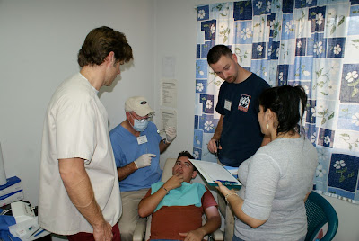 After a tiring, nearly 12-hour trip from Aiken to Quimistan, Karen, Charlie, Randy, and Kevin took about one hour to unload, unpack, eat lunch, and change clothes. By 3:30 today, they were setting up and seeing patients. Ten young people were treated today in four hours, ranging from simple cleanings to multiple fillings and extractions.