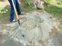Once a few wheelbarrow loads of sand are stacked up, a bag of dry cement is poured onto it and mixed well.