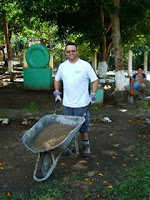 The missionaries did some of the grunt work, as you see Richard here screening river sand, and Danny hauling sand to the work site.