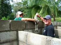 a course of blocks, the missionaries fill in some gaps with mortar to add strength to the wall.