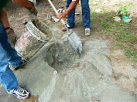 Once a few wheelbarrow loads of sand are stacked up, a bag of dry cement is poured onto it and mixed well.