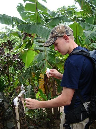 When lunch was finished, Juan Nurcia came and discussed the contaminated water system. Juan took the guys of our team and walked them to the community water tank, a house in the village, and the pila* at the school for water testing, as well as to look at latrines. One unexpected surprise was that there was a rooster sitting on the latrine. Meanwhile, back at the school, Karen was talking with Xiomara (a community health worker and teacher) discussing and learning more about the village. Outside in the schoolyard, Christa and I were have an intense game of soccer with the kids who had stayed from VBS. Intense isn’t exactly the right word; it was more like muddy and messy–but I think we had fun.