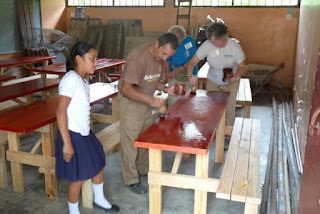 Other words come to mind as well, but adventure describes the day best. The schedule sent us to a mountain village called Nueva Esperanza. The name, which means “new hope” is an apt one, as the village has found new hope in the visits of the HAF teams in the past few years. A few years ago an HAF group from Wilkesboro, N.C. provided a new roof for the schoolhouse, and in this trip we took the makings for 15 picnic tables to be used as desks for the students. We found a very delightful school–students and teachers as well. We don’t know much Spanish, and they know no English, but you’d be surprised how well we communicated with our charade skills, our smiles and gestures, and hugs.