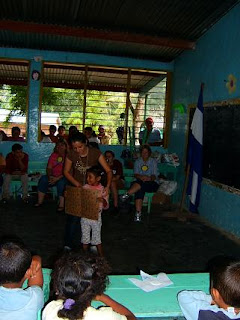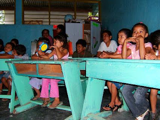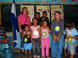 We´ve talked a lot about the Vacation Bible Schools conducted for two days at four different schools in the Quimistan valley. Here are some photos of a group at the Jicaro school, a one-room school in the country. The first photo shows the classroom full of children with several parents peering in the window and a teenager from the Quimistan MPA church teaching the class. If you look closely, you can see that we were imparting God´s word to the whole community including even a neighborhood dog.