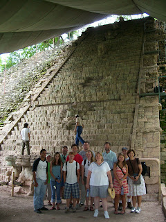 The previous message was presented by the early morning member of the bunch. Now that the day has come to an end, I can add the field trip we bad boys and girls took to Copan. Our guides, Suyapa and Arturo sent us away for the day to see the Mayan Ruins. What am I to say about this is that God’s hand was near to us all. We were given the best tour of our lives. We stood at the base of statues hundreds of years old which were designed to remember those who had been here before. We stood at the base of temples used to celebrate life in ways we cannot imagine. We saw the local horticulture which provided trees for comfort from the sun and branches for the beautiful wild macaws. When God created the earth in six days and took a rest, he created special people who were intelligent and artistic to this day. In addition to this, the Lord blessed us with precious cloud cover, therefore, no sunburn or misery of heat today. Praise Him!