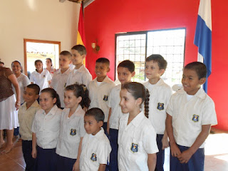 Blown away! That’s what we were this morning when we joined the ceremony opening the new school year at the White Dove School in Santa Clara. More than 60 students were there in their uniforms and eager countenances. One of the teachers served as emcee, speaking both in Spanish and English for the standing-room-only crowd in the multipurpose room. Following an opening prayer in unison by the students and the school director, the student body led the audience in singing the Honduran national anthem and the pledge of allegiance to the Honduran flag.