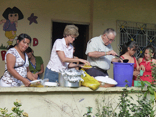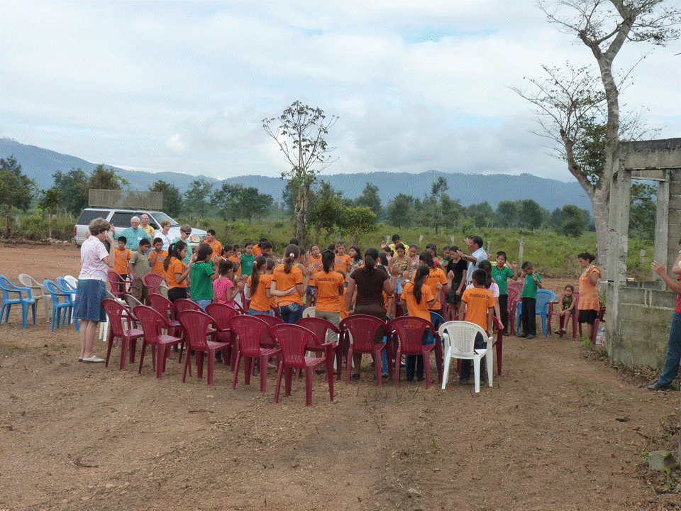 The above photos show: the team cutting out parts for the Fruits of the Spirit tree (VBS), attending Martha’s Sunday School class at Tranquilidad (a surprise to the team), the blessing water being poured around the perimeter of the property, back at Martha’s site and the continuation of class, feeding the children, Vilma teaching AP class in Quimistan, and feeding our AP children.