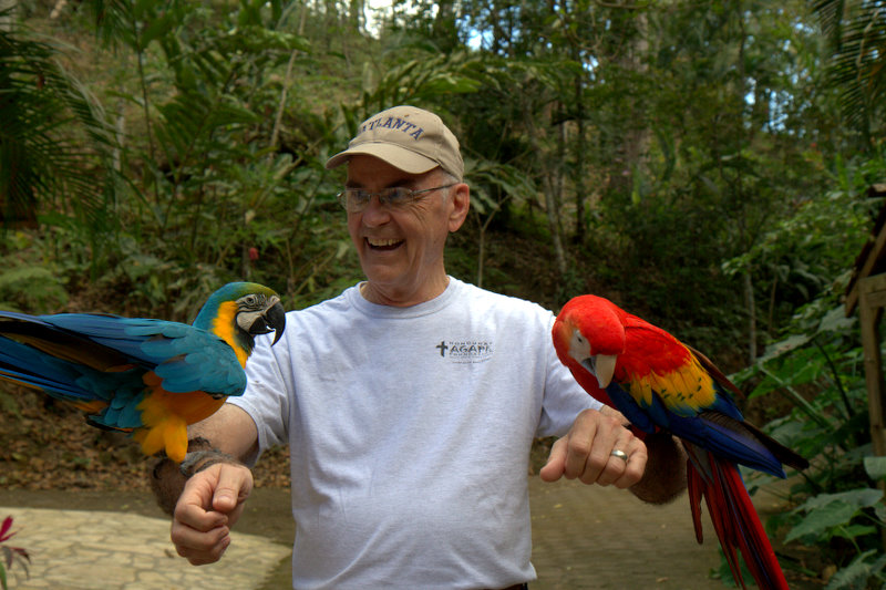 If you are ever in Copán Ruinas, don’t miss a trip to Macaw Mountain, located a few miles north of Copán on a road that can’t possibly lead to anywhere. It’s a thoroughly enjoyable place to visit if you like beautiful birds. While there we encountered some very wise birds who knew how to deal with a problem. Here we see our team leader as he was about to be carried away.