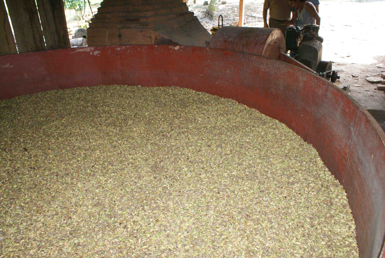 Following the meeting the team walked up the road to visit one of the streams where the community had requested assistance constructing a bridge. On our way back, the teacher took us to the site of a cardamom processing facility, where we observed the large tank containing cardamom berries that were being dried and prepared for packaging. Cardamom is one of the largest cash crops for that community.